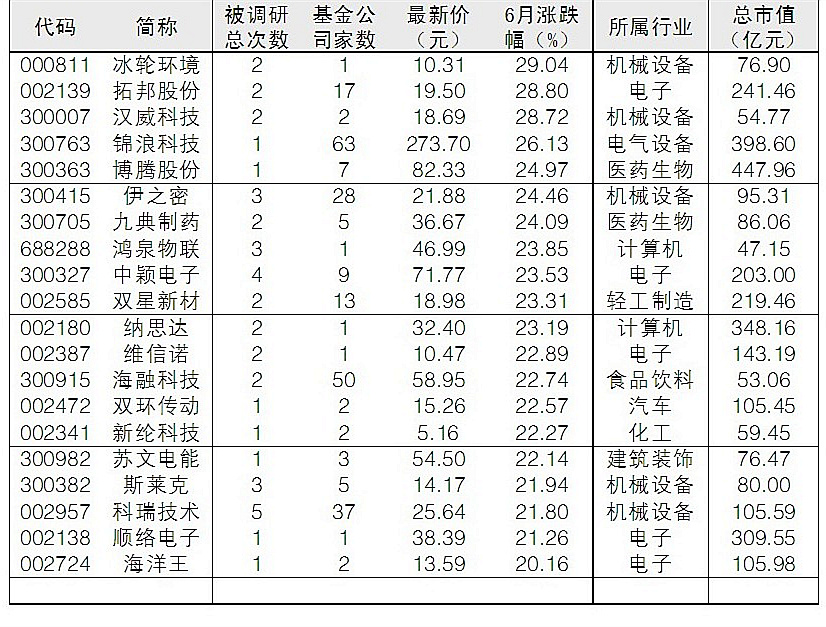41只基金調研股6月漲幅超20%