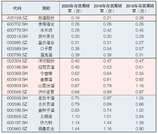 事實上,郎酒股份2018年至2020年,存貨周轉率對比A股白酒同行都處于墊底行列。2019年,18家A股白酒同行的存貨周轉率也全部高于郎酒股份,最低的舍得酒業當時還處于披星戴帽的不利局面,存貨周轉率也有0.26次,最高的伊力特為1.44次,其中12家存貨周轉率高于0.5次。2018年,郎酒股份存貨周轉率也僅比舍得酒業和業績持續大虧的皇臺酒業稍高。