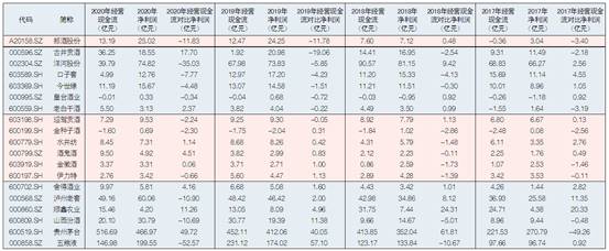 對比來看,18家A股白酒企業中,雖然不少家也出現過經營性現金流凈額低于凈利潤的情況,少數企業現金流甚至長期為負,但經營性現金流凈額長期低于凈利潤的多為營收百億元以下酒企,尤其是業績不佳酒企,7家目前營收超過100億元酒企中只有山西汾酒、古井貢酒情形與郎酒股份類似。
