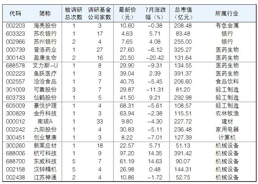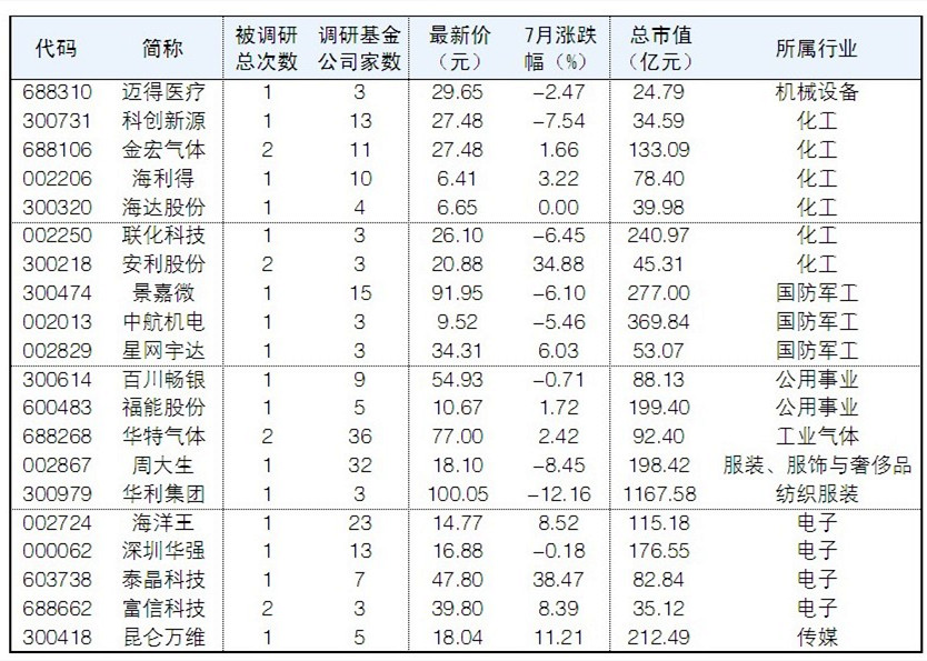 根據Wind數據統計,7月基金公司已經調研了86家公司,其中有40家公司被3家以上基金公司調研。從調研方向來看,基金公司7月偏愛機械設備和化工兩大行業,此外,電子、醫藥生物繼續受到關注。