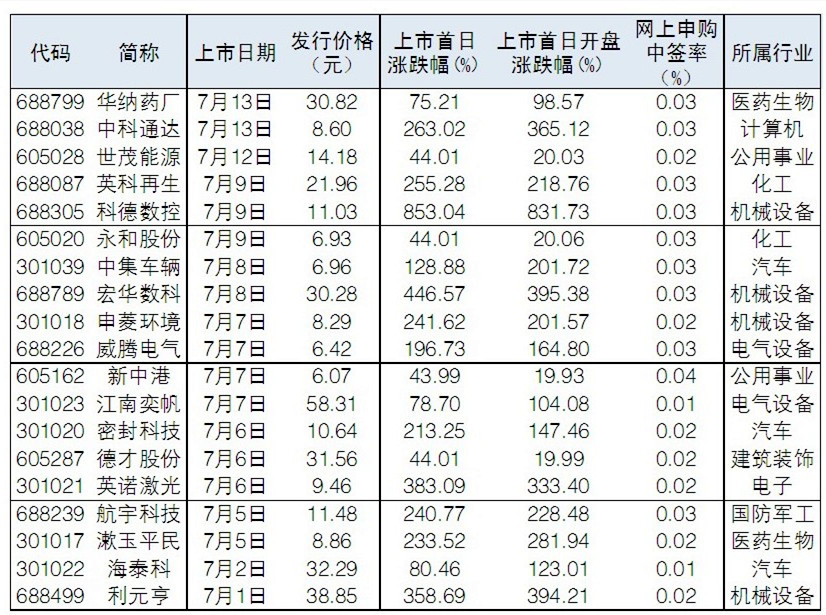 根據(jù)Wind統(tǒng)計(jì),截至昨日,7月已有38只新股上市,以上市首日漲跌幅來看,讀客文化漲幅第一,為1942.58%,創(chuàng)下今年新股上市首日漲幅第一。若按算術(shù)平均值來看,7月上市新股首日漲幅為283.95%。