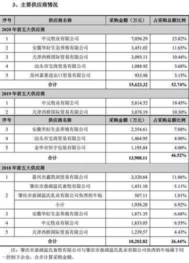 然而令人詫異的是,合計采購金額高達5258.84萬元,占當年度采購占比接近20%的2018年前兩大最重要的供應商,在陽光乳業2019年、2020年的前五大供應商的名單上卻“消失”不見蹤影,而對于公司重大供應商的變化,陽光乳業在招股說明書中并未進行詳細說明。