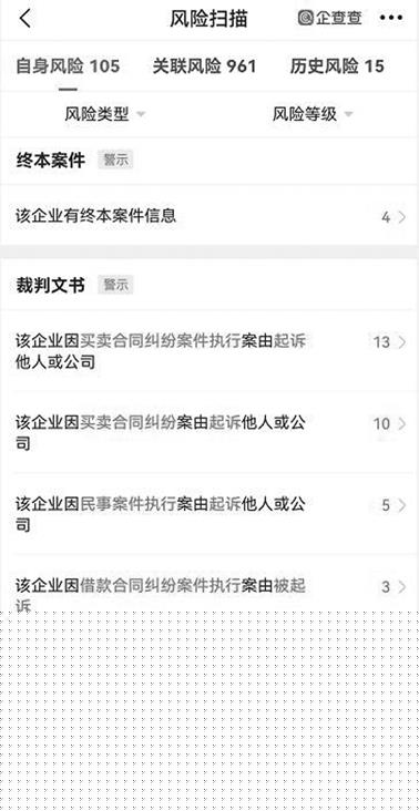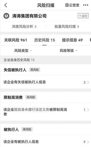 記者通過企查查查詢發現,曹躍進絕對控股的濤濤集團確實有多起因金融借款合同、借款合同糾紛而引發,并作為被告的訴訟,且有4起終本案件(見圖二)。此外,濤濤集團有1條歷史限制消費信息、3條歷史失信被執行人信息、9條歷史被執行信息(見圖三)。曹躍進本人也存在包括法律糾紛的諸多風險事項,歷史風險中也有2條失信被執行信息、2條限制消費信息、8條被執行信息(見圖四)。