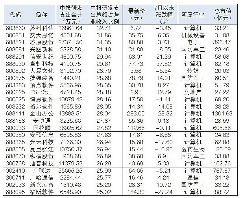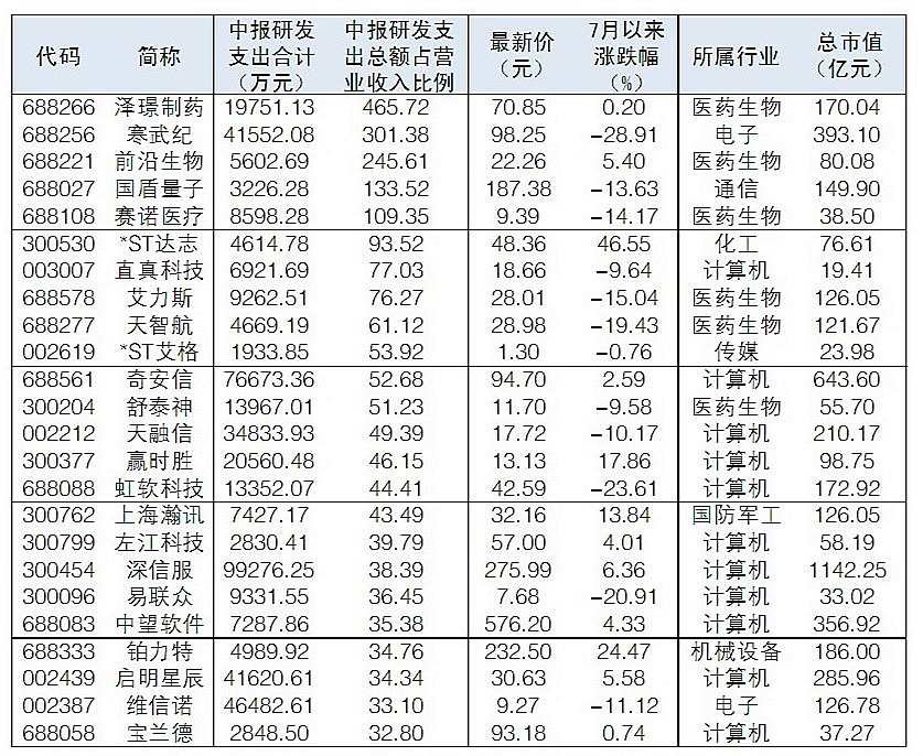 創新和研發水平決定了上市公司技術“護城河”的高低。根據Wind統計,截至昨日,今年上半年有48家公司研發投入總額占營業收入的比例超過25%。