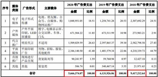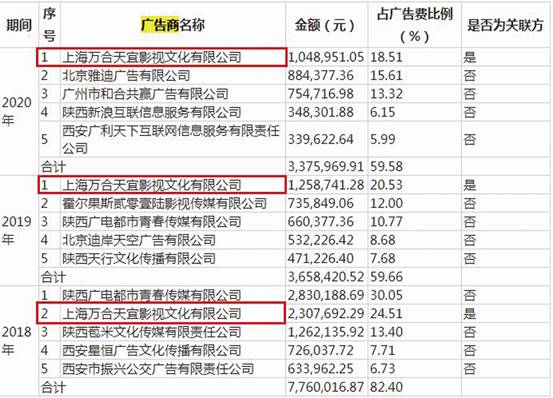 更值得一提的是,根據(jù)招股說明書,報告期內(nèi),上海萬合天宜影視文化有限公司一直是冰峰飲料前五大廣告商,其中2018年其為公司第二大廣告商,2019-2020年皆為公司第一大廣告商,其中2018-2020年,冰峰飲料向其廣告投入分別為230.80萬元、125.87萬元、104.90萬元,分別占公司當(dāng)年度廣告投放量的24.51%、20.53%、18.51%(見圖四)。