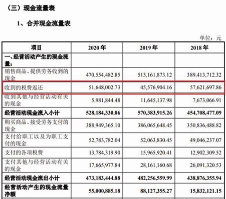招股書顯示,2018-2020年,宏宇五洲收到的稅費(fèi)返還金額分別為5762.17萬元、4557.69萬元、5164.80萬元,占當(dāng)期凈利潤(rùn)的比例分別為170.63%、86.16%、91.02%(見圖一)。