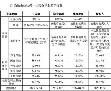 而同行業(yè)的可比上市公司中,康德萊其五險(xiǎn)的繳納比例為99%,還有三鑫醫(yī)療的養(yǎng)老、醫(yī)療繳納比例為100%、其失業(yè)、生育保險(xiǎn)的繳納比例也達(dá)85%,而與宏宇五洲同一地域的玉禾田、華業(yè)香料、集友股份的社保繳納比例也都遠(yuǎn)遠(yuǎn)高于宏宇五洲(見圖三)。