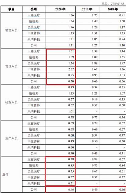 就管理人員的薪酬來看,偏低情況更加明顯。2018-2020年,宏宇五洲管理人員的薪酬分別為0.66萬元/月、0.66萬元/月、0.70萬元/月,在同行業可比的三鑫醫療、康德萊、奧美醫療、中紅普林、采納科技等中最低,如果以2020年管理人員平均月薪計算,不足三鑫醫療、奧美醫療的一半,連中紅普林管理人員平均月薪的三分之一都不到。