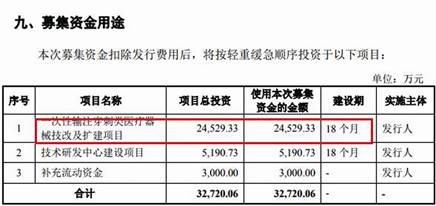 對于一次性輸注穿刺類醫療器械技改及擴建項目的建設,在招股書中,宏宇五洲對項目建設的必要性、可行性、項目的投資概算、可能存在的環保問題及采取的措施進行了分析,該項目建設擬定為18個月,包括前期準備、建筑工程、設備采購、安裝調試及試生產等。