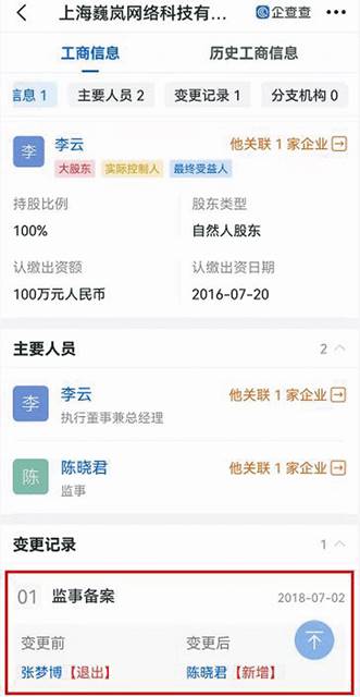 圖一:企查查關(guān)于上海巍嵐監(jiān)事變更信息截圖