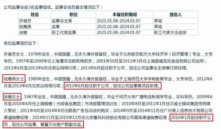 張夢博在旭旻文化接替的對象徐姍不一般——賓酷網(wǎng)絡(luò)招股書顯示:“2019年初,公司監(jiān)事為許蓓芳、陸雁燕、徐姍”,此外,徐珊還是公司現(xiàn)任職工代表監(jiān)事、掌翼文化(賓酷網(wǎng)絡(luò)全資子公司)客戶群副總監(jiān)(見圖三)。通過企查查查詢工商信息顯示,徐姍與陸雁燕在2017年12月25日起,擔(dān)任賓酷網(wǎng)絡(luò)監(jiān)事。