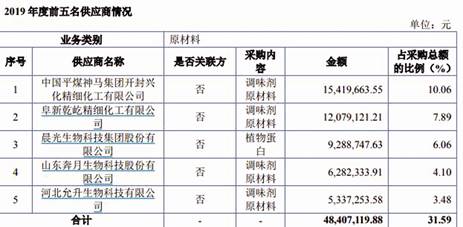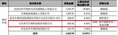 其中,招股書(shū)對(duì)美農(nóng)生物2019年度前五大供應(yīng)商的披露為:當(dāng)年度,美農(nóng)生物的前五大供應(yīng)商分別為河南開(kāi)封平煤神馬興化精細(xì)化工有限公司、阜新乾屹精細(xì)化工有限公司、晨光生物科技集團(tuán)股份有限公司及其關(guān)聯(lián)方、山東奔月生物科技股份有限公司(以下簡(jiǎn)稱“山東奔月”)、河北允升生物科技有限公司,公司向其采購(gòu)金額分別為1541.97萬(wàn)元、1207.91萬(wàn)元、 928.87萬(wàn)元、628.42萬(wàn)元、533.73萬(wàn)元,合計(jì)共采購(gòu)4840.90萬(wàn)元,合計(jì)采購(gòu)額的占比為34.09%(見(jiàn)圖一)。