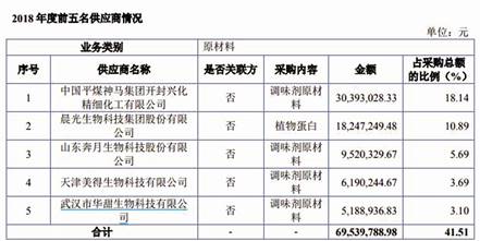 記者發(fā)現(xiàn),兩版說(shuō)明書(shū)對(duì)2018年度前五大供應(yīng)商名單和采購(gòu)數(shù)據(jù)披露的差異,主要集中在當(dāng)年度第二大供應(yīng)商。招股書(shū)顯示,2018年度第二大供應(yīng)商為晨光生物科技集團(tuán)股份有限公司及其關(guān)聯(lián)方,公司當(dāng)年度向其采購(gòu)棉籽蛋白,采購(gòu)金額為1710.69萬(wàn)元,占當(dāng)年度原材料采購(gòu)總額的10.62%(見(jiàn)圖三),
