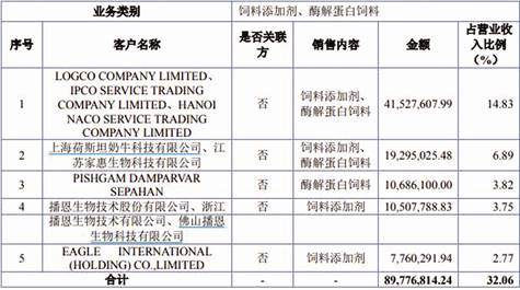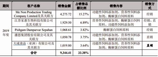 其于2020年發(fā)布的公開(kāi)轉(zhuǎn)讓說(shuō)明書(shū)顯示,公司2019年第一大客戶為L(zhǎng)OGCO COMPANY LIMITED、IPCO SERVICE TRADINGCOMPANY LIMITED、HANOINACO SERVICE TRADINGCOMPANY LIMITED;第二大客戶為上海荷斯坦奶牛科技有限公司、江蘇家惠生物科技有限公司;第三大客戶為PISHGAM DAMPARVARSEPAHAN、第四大客戶為播恩生物技術(shù)股份有限公司、浙江播恩生物技術(shù)有限公司、佛山播恩生物科技有限公司;第五大客戶為EAGLE INTERNATIONAL(HOLDING) CO.,LIMITED(見(jiàn)圖六)。