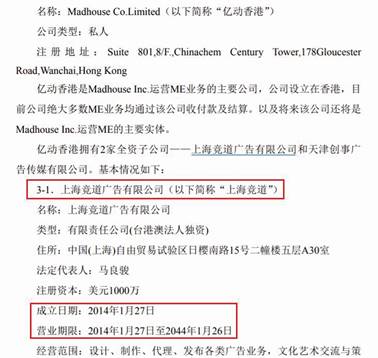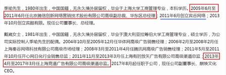 進一步查詢顯示,上海競道目前系A股企業藍色光標控股子公司的全資子公司,藍色光標2015年12月1日發布的為上海競道提供擔保公告中,顯示的上海競道基本信息包括成立日期為2014年1月27日。另外,藍色光標2015年11月初發布的擬收購上海竟道母公司股權估值報告中同樣顯示,上海竟道成立于2014年1月27日(見圖四、圖五)。 賓酷網絡披露的控股股東、實控人季瑜及其配偶戴崴履歷,與騰信股份和藍色光標公告以及工商登記信息等存在出入的情形,引發諸多疑問: