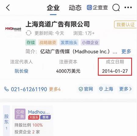 通過企查查查詢的工商登記信息顯示,上海競道廣告有限公司(以下簡稱“上海競道”)成立于2014年1月27日(見圖三)。這意味著,上海競道還未成立前,戴崴便入職。