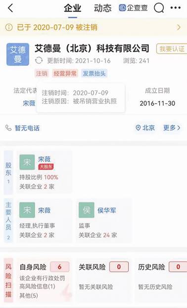 企查查更顯示,艾德曼(北京)科技有限公司(以下簡稱“艾德曼”)成立于2016年11月30日,2020年7月9日注銷,注銷原因為被吊銷營業執照(見圖一)。此外,該企業2017-2018年存在三條經營異常信息,包括未按照規定期限公示年度報告、通過登記的住所或者經營場所無法聯系(見圖二)。2018年10月16日該企業被北京海淀區市監局處以吊銷營業執照的行政處罰,原因是成立后無正當理由超過6個月未開業,或者開業后自行停業連續超過6個月以上的公司。以此來看,艾德曼“空殼公司”意味濃厚。