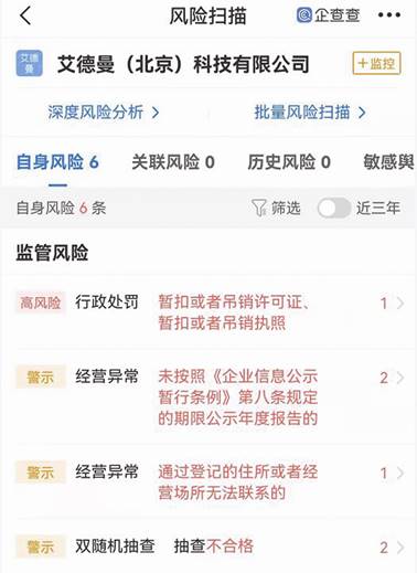 圖二:企查查關于艾德曼行政處罰和經營異常信息截圖