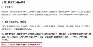 至于補流必要性、合理性,文華財經的說法是:“公司處于軟件和信息技術服務行業,產品從研發到投入市場實現盈利有一定的期間,因此需要公司具備一定的流動資金和融資能力。公司為提高核心技術水平、加強競爭優勢,同時進行多個在研項目,加大了對人才和技術的投入,報告期內,公司研發費用分別為2306.46萬元、3232.71萬元、3454.42萬元和2077.16萬元,占營業收入比重分別為17.20%、15.40%、17.98%和19.76%?!?/p>