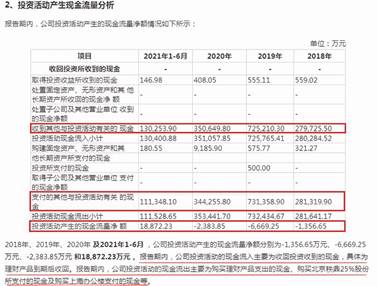 而從文華財經的投資活動現金流凈額來看,除了2021年上半年,2018-2020年全部為負值,且金額在-1300萬元至-6700萬元區間,尤其是2019年接近-6700萬元,意味著公司在投資方面長期處于凈支出的投資付出狀態。