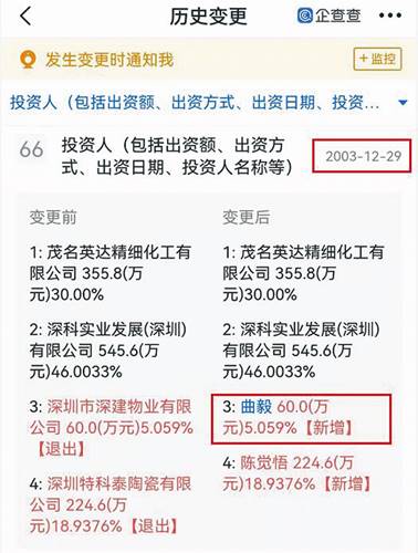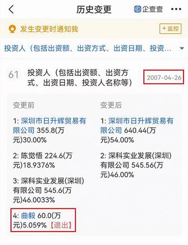 這一答案在通過企查查查詢的華輝裝飾工商變更登記信息中可以找到——2003年12月29日,華輝裝飾發(fā)生投資人變更登記,曲毅成為新股東、持股比例5.059%。到2007年4月26日,曲毅轉讓5.059%的全部股權,但透過深圳市日升輝貿易有限公司繼續(xù)間接持股(2004年4月成立、2014年4月注銷,存續(xù)期間曲毅持股20%并列第一大股東),2010年11月9日又重新直接持股12.80%(見圖二、三、四)。