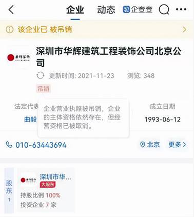 此外,企查查查詢的工商登記信息顯示,曲毅是1993年6月成立的深圳市華輝建筑工程裝飾公司北京公司(以下簡稱“華輝裝飾北京公司”)的法定代表人(見圖六),其為華輝裝飾全資子公司,不過其已被吊銷,但吊銷時間未顯示,其存續(xù)期間未發(fā)生過任何變更。