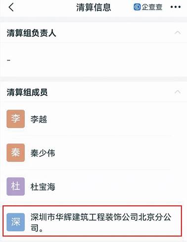 此外,時代裝飾2020年招股書曾披露,實際控制人之一的李越在報告期內還曾控制北京龍越華輝建筑裝飾材料有限公司(以下簡稱“龍越華輝”),其于2017年9月1日完成注銷登記。而企查查顯示的該企業(yè)清算信息中,清算組成員除了李越等3個自然人之外,赫然出現(xiàn)名為深圳市華輝建筑工程裝飾公司北京分公司的企業(yè)(見圖七)。