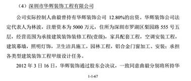 至于日升輝,華輝裝飾的工商登記變更信息可以勾勒其從進入到退出的全過程——2005年2月21日,曲毅持股20%的日升輝成為華輝裝飾持股30%新股東,曲毅繼續直接持有華輝裝飾5.059%的股權。到了2007年4月26日,日升輝增持華輝裝飾至持股54%,成為后者控股股東,曲毅同日退出。不過,2010年11月9日,日升輝轉讓了所持華輝裝飾54%的全部股權,曲毅同日重新直接持有華輝裝飾股權12.80%。