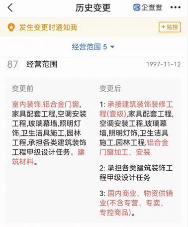 通過企查查查詢的工商變更信息顯示,華輝裝飾在1997年11月12日起,經營范圍在變更后包括上述內容(見圖二)。