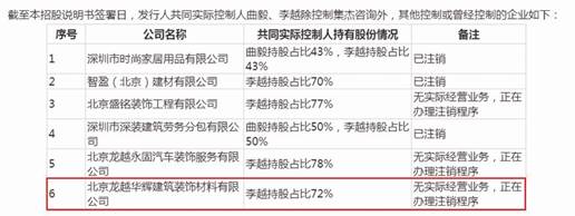 同時,公司招股書顯示,北京龍越華輝建筑裝飾材料有限公司(以下簡稱“龍越華輝”)由同為公司控股股東、實際控制人暨曲毅一致行動人的李越控制——擁有龍越華輝100%股權,已于2017年9月1日注銷。