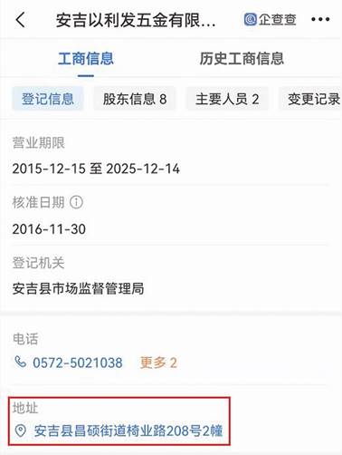 通過企查查查詢的工商登記信息顯示,2015年12月15日成立的安吉以利發,注冊地址為安吉縣昌碩街道椅業路208號2幢,并且地址始終未發生過變更(見圖一)。同時,記者查詢還發現,在安吉以利發2015年向當地市監機構提交的企業年報中,企業通訊地址為安吉縣昌碩街道椅業路208號1-4幢(見圖二)。