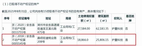 招股書顯示,護童科技2015年8月18日成立,注冊地址、主要生產經營地址均為浙江省湖州市遞鋪街道龍王溪北路475號。不過,記者通過企查查查詢的護童科技工商登記信息顯示,公司曾經的地址為安吉縣昌碩街道椅業路208號1、2、3、4幢(見圖三)。公司招股書也顯示,公司擁有的自有房產包括位于昌碩街道椅業路208號的一處房產,建筑面積25806.15平米,土地性質為工業用地(見圖四)。