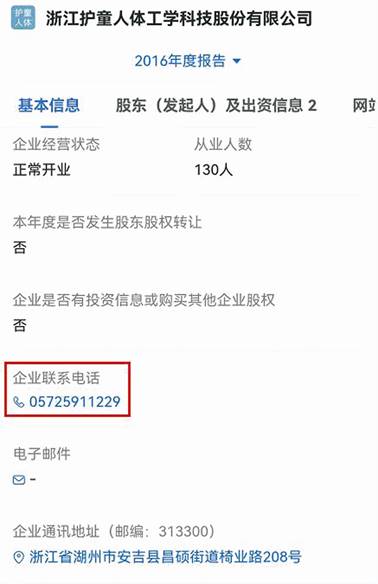 蹊蹺之處還有——安吉以利發曾使用與護童科技相同的固定電話。企查查信息顯示,安吉以利發向當地市監機構提交的2015年企業年報顯示,企業聯系電話為0572-5911229(見圖二)。而記者查詢的護童科技向當地市監機構提交的2016年企業年報中,聯系電話也赫然是0572-5911229(見圖七)。