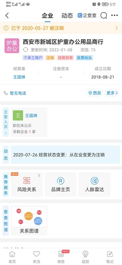 西安市新城區(qū)護(hù)童辦公用品商行,企查查查詢的工商登記信息顯示,該個(gè)體工商戶的經(jīng)營者、主要人員也并非劉登科,同樣存在代持(見圖七)。不過,該企業(yè)在2020年5月27日注銷,其2019年7月曾因未按照規(guī)定報(bào)送年度報(bào)告被列入經(jīng)營異常名錄。記者 爾東