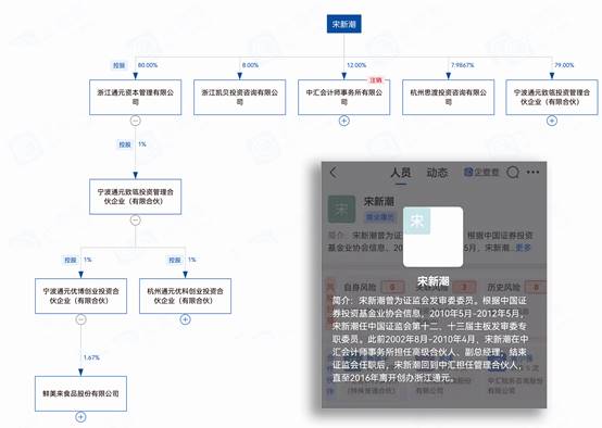 鮮美來招股書則顯示,公司IPO的會計師事務所為中匯會計師事務所(特殊普通合伙),該所位于杭州,負責人為余強。企查查查詢的工商登記信息顯示,宋新潮曾是該所合伙人,退出日期為2016年5月6日,退出時出資比例為8%,余強彼時出資比例為17%,目前出資比例約為11.49%,為出資比例最高的合伙人。