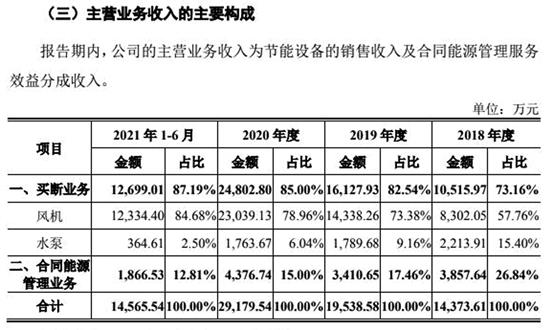 2018-2021年6月,瑞晨環保高效節能離心風機、高效節能離心水泵兩大核心產品的收入分別為1.44億元、1.95億元、2.92億元、1.46億元,占公司營業收入的比例分別為99.62%、99.31%、97.80%、98.00%。