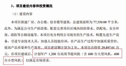根據招股書披露的瑞晨環保擬募投2.99億元的高效節能風機產業化建設項目的資金運用計劃,其中0.99億元用于購買主要生產設備,2億元募資款擬用于生產用建筑、工程費用及工程建筑等其它費用。