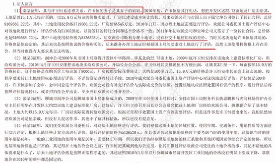 判決書還進(jìn)一步披露了開(kāi)發(fā)區(qū)中華路西、華宇路北國(guó)有建設(shè)用地轉(zhuǎn)讓細(xì)節(jié):“姚某3證明,潤(rùn)坤公司2006年從市國(guó)土局取得開(kāi)發(fā)區(qū)中華路西、華某北的22.73畝土地,2009年底許玉恒安排在該地塊上建設(shè)標(biāo)準(zhǔn)化廠房,租給歡派公司。2010年4月,許玉恒安排把該地塊賣給歡派公司。開(kāi)局長(zhǎng)辦公會(huì)前,許玉恒對(duì)其安排說(shuō)他不方便出面,讓姚某3匯報(bào)一下,每畝按照15.9萬(wàn)元的價(jià)格轉(zhuǎn)讓,這個(gè)價(jià)格是在購(gòu)買價(jià)上每畝加了8000元,廠房按照實(shí)際花費(fèi)轉(zhuǎn)讓,大約是500多萬(wàn)元。15.9萬(wàn)元的價(jià)格是許玉恒安排其在會(huì)上這么說(shuō)的。按程序要求轉(zhuǎn)讓土地使用權(quán)必須進(jìn)行評(píng)估,不評(píng)估沒(méi)法辦理轉(zhuǎn)讓手續(xù)。2010年底,歡派公司委托市國(guó)土資產(chǎn)評(píng)估中心對(duì)這塊地進(jìn)行評(píng)估,評(píng)估價(jià)是500多萬(wàn)元,許玉恒參加了會(huì)審,會(huì)審?fù)膺@個(gè)評(píng)估價(jià)。歡派公司沒(méi)有補(bǔ)交評(píng)估價(jià)與實(shí)際成交價(jià)的差額。處置該地塊應(yīng)按照處置國(guó)有資產(chǎn)的程序,進(jìn)行評(píng)估后再按照評(píng)估情況轉(zhuǎn)讓,或者招拍掛公開(kāi)出讓,至少應(yīng)讓歡派公司補(bǔ)齊差價(jià)。”