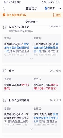 另外,在招股書中,乖寶寵物稱注銷歡派公司的原因是“聊城市國(guó)土資源局收回山東歡派位于聊城市經(jīng)濟(jì)技術(shù)開(kāi)發(fā)區(qū)中華路西、華宇路北國(guó)有建設(shè)用地使用權(quán)一宗”“無(wú)經(jīng)營(yíng)場(chǎng)所”。而記者查詢判決書發(fā)現(xiàn),2016年4月25日,聊城市國(guó)土資源局與歡派公司簽訂收回國(guó)有土地使用權(quán)協(xié)議書,收回補(bǔ)償費(fèi)用為643.96萬(wàn)元。另?yè)?jù)企查查顯示,歡派公司已于2015年1月將住所由“聊城經(jīng)濟(jì)開(kāi)發(fā)區(qū)中華北路6號(hào)”變更為“聊城經(jīng)濟(jì)開(kāi)發(fā)區(qū)牡丹江路8號(hào)(海創(chuàng)工貿(mào)院內(nèi))”(見(jiàn)圖四),變更后與乖寶寵物位于同一地址。