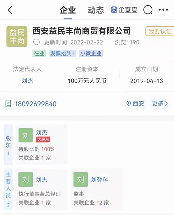 疑點源頭在2017年3月成立的西安寶貝,企查查顯示,劉登科持股100%并為法定代表人、執行董事、總經理,監事為王國淋。