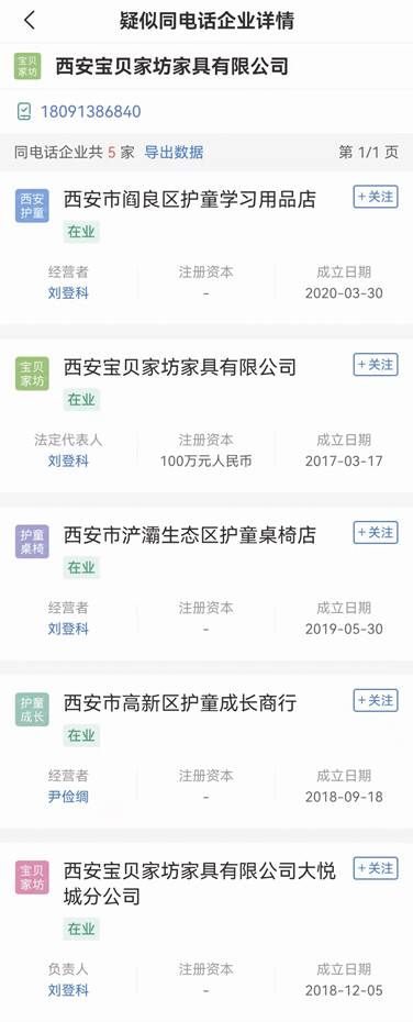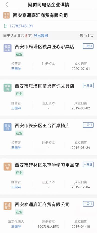 王國淋,系護童科技招股書中披露的劉登科所控制的泰通嘉匯法定代表人和唯一股東。而泰通嘉匯登記的聯系電話17782745191,又與西安市雁塔區獨具匠心家具店、西安市雁塔區童桌有你文具店、西安市長安區王合百桌椅店、西安市碑林區樂享學學習用品店相同,這四家店經營者也都叫王國淋,成立時間在2019年5月至2020年7月期間(見圖五)。四家店經營范圍均包括銷售家具或辦公用品或桌椅。