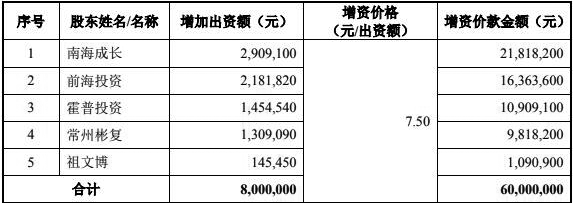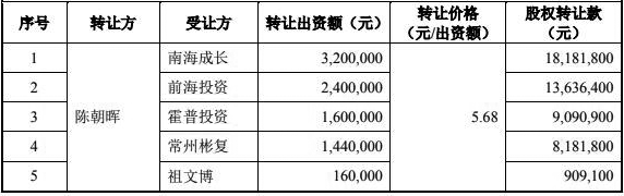 根據(jù)招股書,2019 年12月20日,公司作出股東會(huì)決議,同意陳朝暉將其持有的公司部分股權(quán)轉(zhuǎn)讓給南海成長(zhǎng)、霍普投資、前海投資、常州彬復(fù)、祖文博, 當(dāng)日各方分別簽訂 《股權(quán)轉(zhuǎn)讓協(xié)議》,相關(guān)轉(zhuǎn)讓款已支付完畢,而此次股權(quán)轉(zhuǎn)讓的增資價(jià)格為5.68元/出資額(見圖一)。