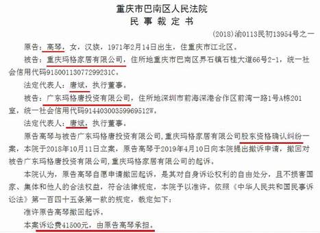 中國裁判文書網2019年4月發布的《高琴與廣東瑪格唐投資有限公司、重慶瑪格家居有限公司股東資格確認糾紛一審民事裁定書》(見圖二)顯示,原告高琴與被告瑪格唐投資、瑪格有限股東資格確認糾紛一案,于2018年10月11日立案,原告高琴于2019年4月10日向本院提出撤訴申請,撤回對被告瑪格唐投資、瑪格有限的起訴。被告瑪格唐投資、瑪格有限的法定代表人均為唐斌。
