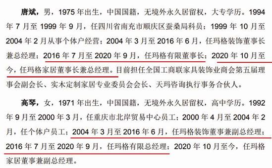 據招股書披露,“高琴,女,1971年出生,中國國籍,無境外永久居留權,高中學歷。1992年9月至2000年3月,任重慶市北岸貿易中心員工;2000年4月至2004年2月,任個體戶員工;2004年3月至2016年6月,任瑪格裝飾董事兼副總經理;2016年7月至2020年9月,任瑪格有限總經理;2020年10月至今,任瑪格家居董事兼副總經理。”