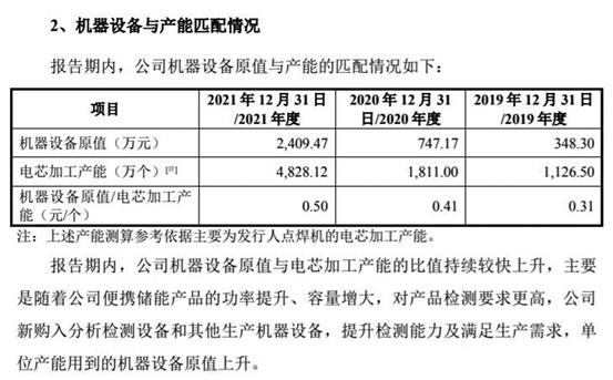 公司的說法是,“報告期內(nèi),公司機器設(shè)備原值與電芯加工產(chǎn)能的比值持續(xù)較快上升,主要是隨著公司便攜儲能產(chǎn)品的功率提升、容量增大,對產(chǎn)品檢測要求更高,公司新購入分析檢測設(shè)備和其他生產(chǎn)機器設(shè)備,提升檢測能力及滿足生產(chǎn)需求,單位產(chǎn)能用到的機器設(shè)備原值上升。”