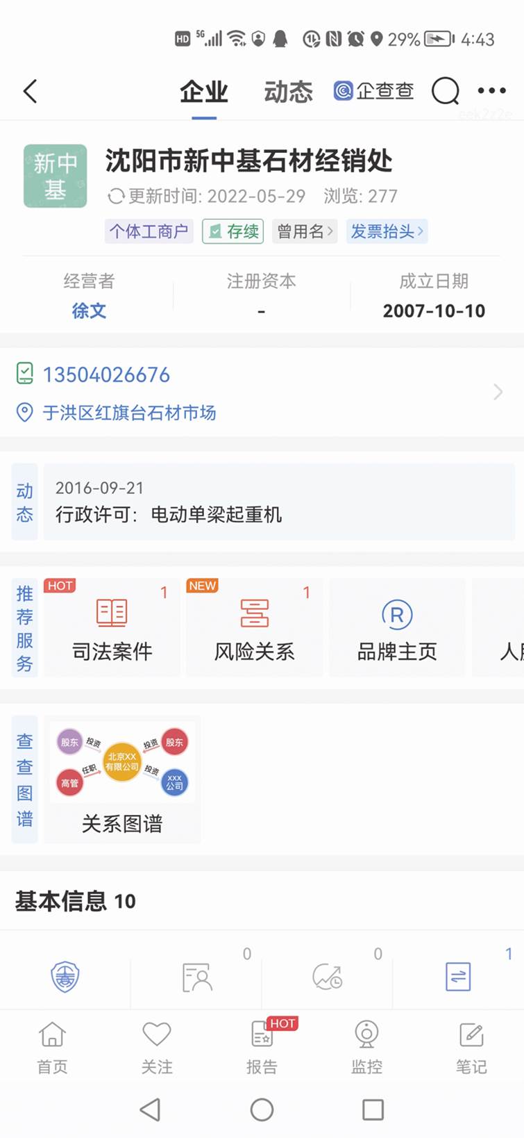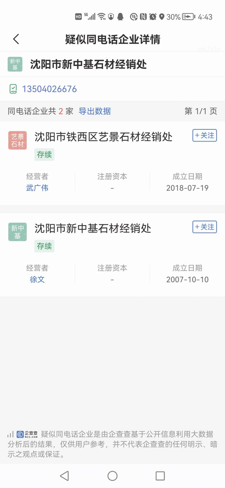 企查查信息顯示,沈陽市新中基石材經銷處成立于2007年10月10日,該企業向當地市監機構提交的2019年年報顯示,聯系電話為13504026676(見圖一)。