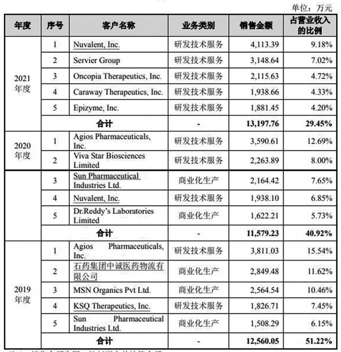 2020年除了公司的第一大客戶Agios Pharmaceuticals, Inc.、第二大客戶Sun Pharmaceutical Industries Ltd.分別為2019年度第一大、第五大客戶以外,另外三大客戶與2019年度均不相同,如2019年公司第二大客戶為石藥集團中誠醫藥物流有限公司,公司向其銷售商業化生產服務,合計當年向其銷售2849.48萬元,占當年營收比例為11.62%,第三大客戶為MSN Organics Pvt Ltd.,當年公司向其銷售金額達2564.54萬元,向其銷售金額達1826.71萬元的第四大客戶KSQ Therapeutics, Inc.,上述企業均未出現在2020年前五大客戶的名單上,而2019年公司向上述三大客戶的銷售金額合計超過7000萬元,占公司當年度營業收入的29.53%。
