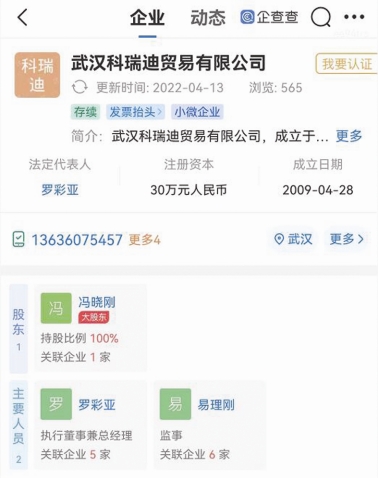 記者通過企查查查詢的工商登記信息顯示,武漢科瑞迪目前的唯一股東為馮曉剛,執行董事、總經理及法定代表人為羅彩亞,易理剛只擔任監事(見圖一)。