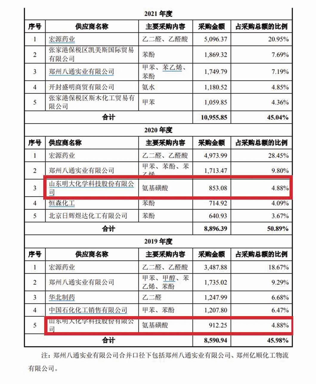 而2021年明大科技未進入新天地前五大供應商名單,對于明大科技的退出,新天地稱“主要系公司更多地向其他氨基磺酸供應商采購氨基磺酸所致。”