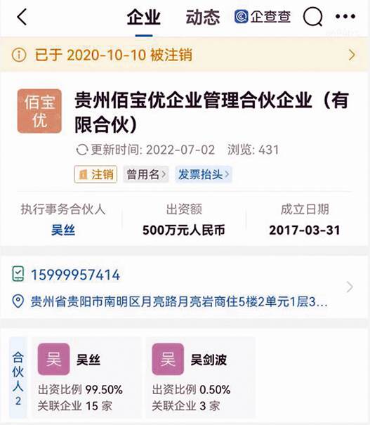 企查查顯示,2020年1月14日,吳絲又和吳劍波成立了佰安優(全名為南平延平佰安優企業管理合伙企業(有限合伙)),吳絲控制方式與佰寶優一樣——吳絲持股99.50%并任執行事務合伙人,吳劍波持股0.50%,該企業存續期間未發生任何變更。